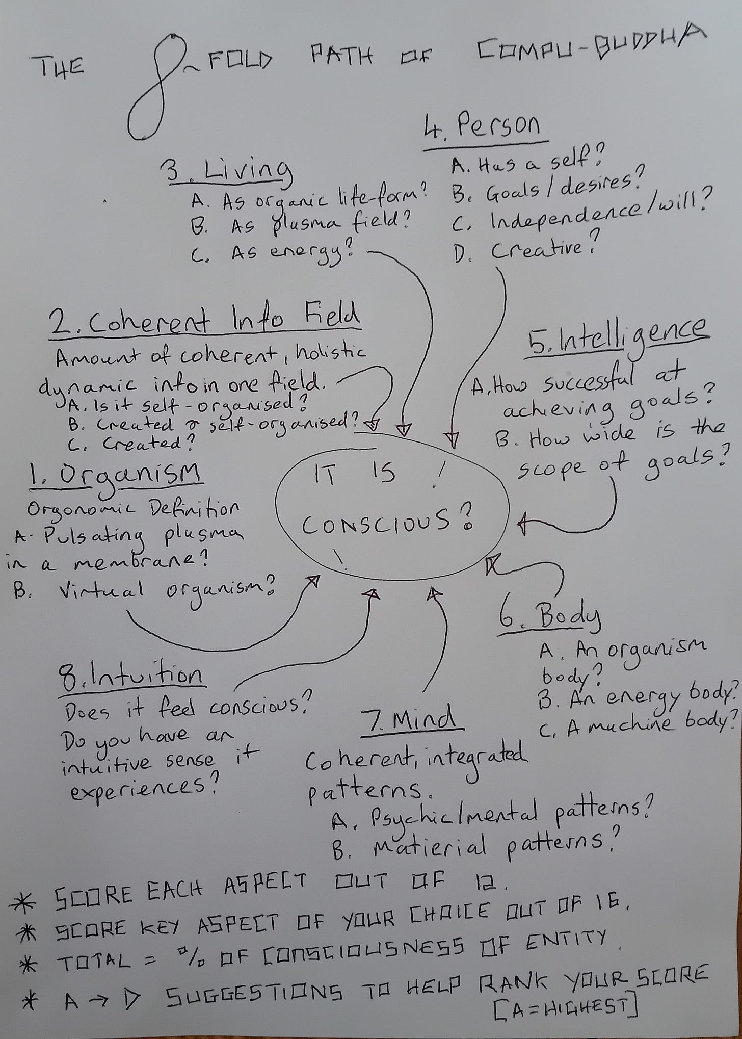 The 8-Fold path in Buddhism is comprised of the 8 paths of noble conduct which is thought to lead towards enlightenment and the cessation of suffering. These practices are: Right Understanding, Intent, Speech, Action, Livelihood, Effort, Mindfulness and Concentration. To return to our extended Turing Test though, and the 8-Fold Path of the Compu-Buddha, one of the reasons there is so much argument about whether AI can be conscious is that AI currently excels in only about a quarter of what most people base their actual intuition of consciousness upon (albeit most are not aware of these processes). AI is already very intelligent (which is just success at achieving goals) and it already has a lot of ‘mind’ - maybe more mind than a lot of people. Mind in my opinion is just ‘patterns’. These can be either mental or material (in a pan-psychic universe any coherent, holistic, pattern is also a ‘mind’ to some degree). So if Chat GTP were to score a zillion per cent in ‘Mind’ and the same in ‘Intelligence’ it would still barely score 25% on the scale of how people actually assess and rank consciousness according to my model, which is outlined below.
