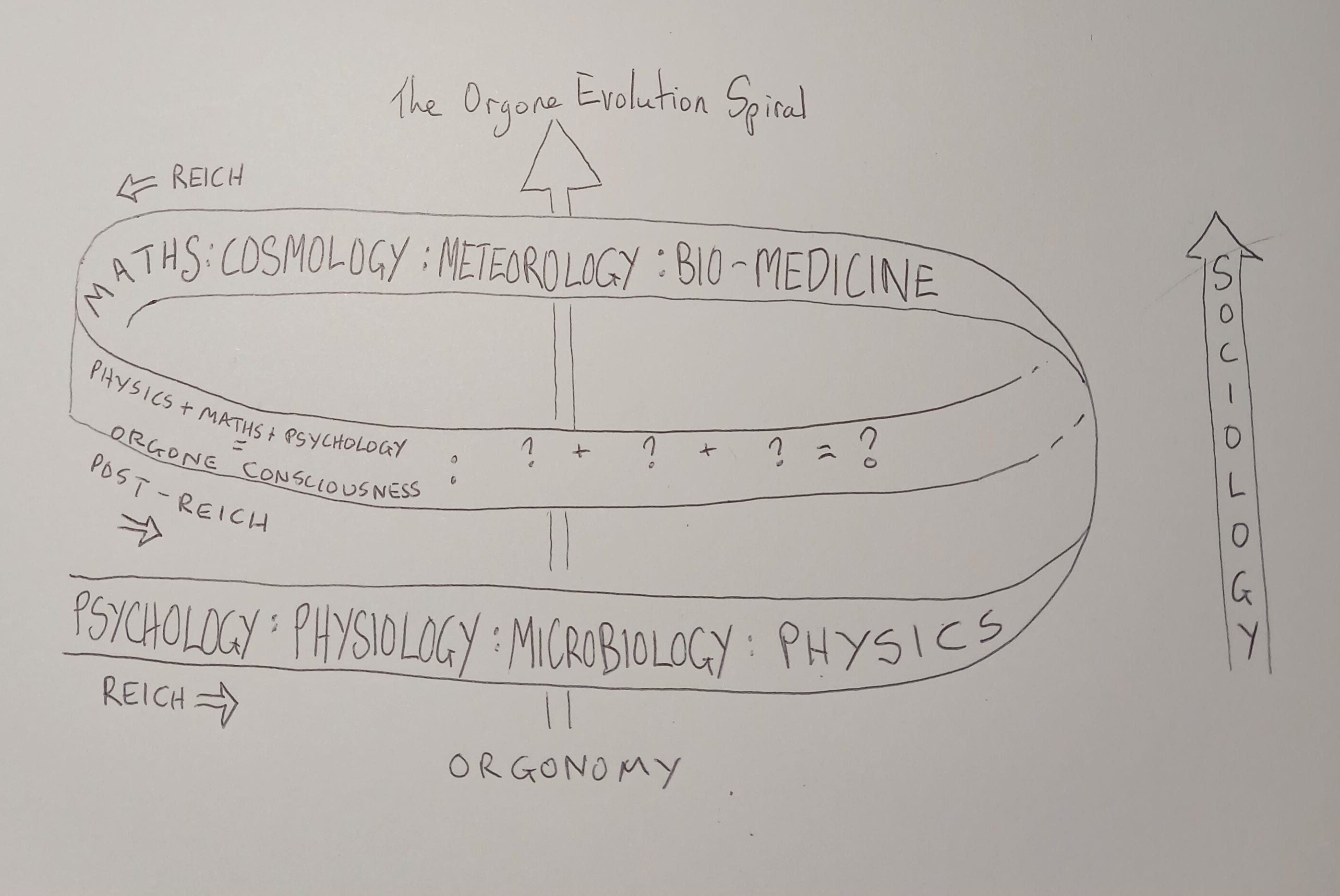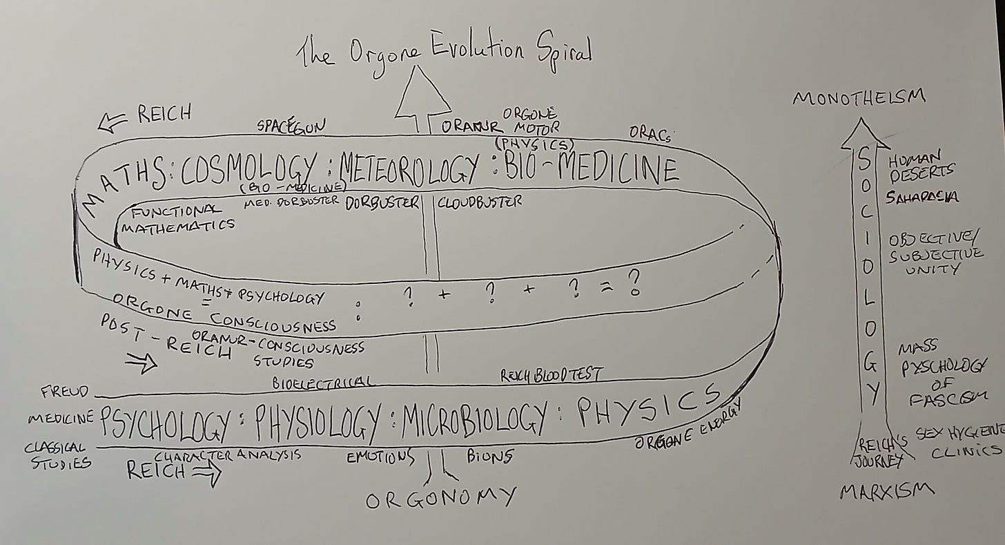 But to return to the orgone spiral, my own work utilises a basic but creative maths, some basic oranur or orgone physics, and dream and personal psychology to examine consciousness. In a sense my work has gone full circle right back to the beginning of orgonomy in psychology. Following this motion the next stage might involve microbiology, bio-medicine and cosmology perhaps or some other combination of the first iteration of orgonomy.