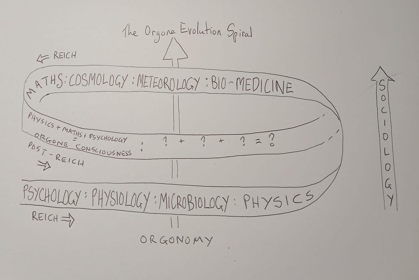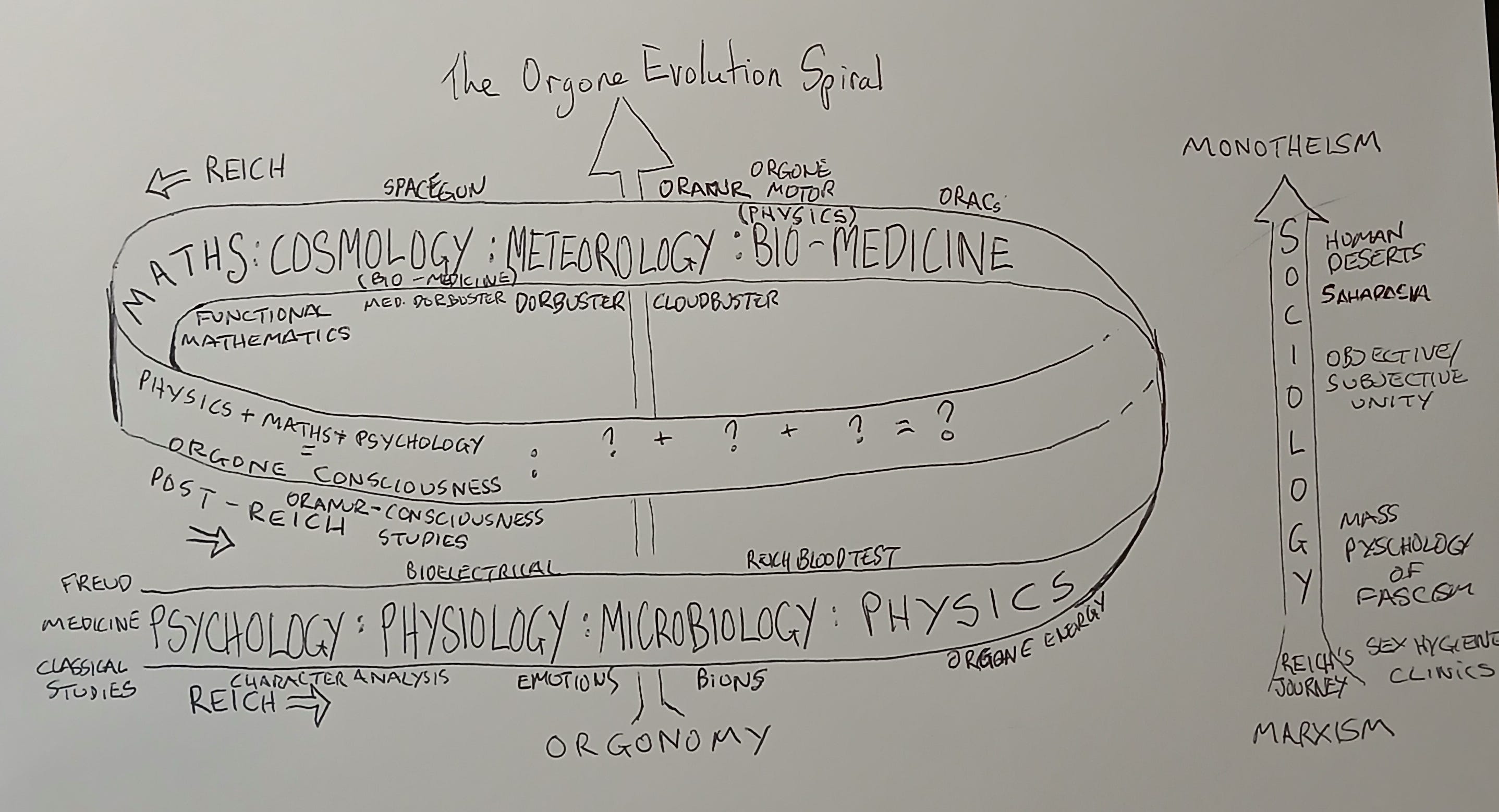 Below is the spiral again with the main inventions added. Also, orgonomy has always had a sociological side, right from the beginning. This is illustrated with the main steps he took as the sociological arrow next to the spiral. The sociological journey is one from Marx to Moses one might say.